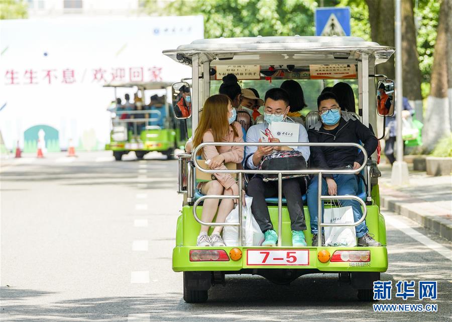 5月15日,在西南大學校園內(nèi),學生們搭乘校內(nèi)轉(zhuǎn)運車前往各自的宿舍。當日,重慶西南大學迎來疫情以來首批返校大學生。據(jù)介紹,按照疫情防控的需要,重慶市高校2020年春季學期從5月11日起按照“一校一策”原則,實行錯峰錯時分批次有序開學復課。新華社記者劉潺攝