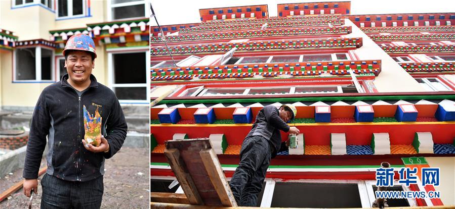 拼版照片:左圖為西藏昌都市卡若區(qū)卡若鎮(zhèn)卡若村村民洛松郎直;右圖為洛松郎直在昌都市一處建筑工地進(jìn)行外墻彩繪作業(yè)。洛松郎直從小就喜歡畫畫,由于家境貧寒,初中畢業(yè)后,他回到家里干農(nóng)活、放牧,挑起家庭重?fù)?dān),但一直沒有放棄畫畫的夢想。后來,洛松郎直前往卡若區(qū)拉多鄉(xiāng)學(xué)習(xí)唐卡繪畫,技藝得到很大提高。2017年,洛松郎直為卡若區(qū)一個(gè)周轉(zhuǎn)房建設(shè)項(xiàng)目繪制墻體彩繪。2018年,在村里的支持下,洛松郎直創(chuàng)辦了公司,承攬更多的藏式墻體彩繪工程(4月30日攝)。新華社記者詹彥攝