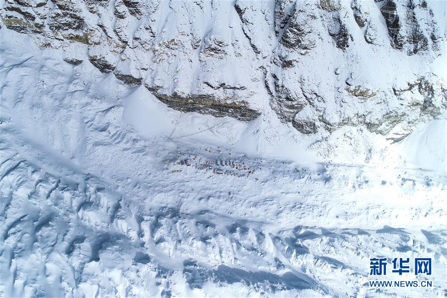 位于珠峰東絨布冰川旁海拔6500米的珠峰前進(jìn)營地(5月22日攝,無人機(jī)照片)。