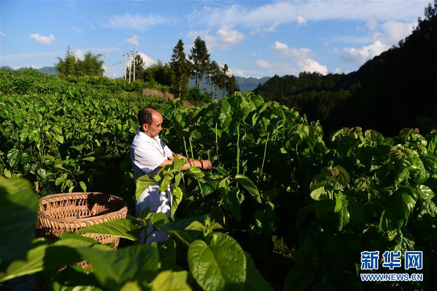 5月29日,奉節(jié)縣新民鎮(zhèn)中嶺村蠶桑產業(yè)扶貧基地工作人員在采摘桑葉。