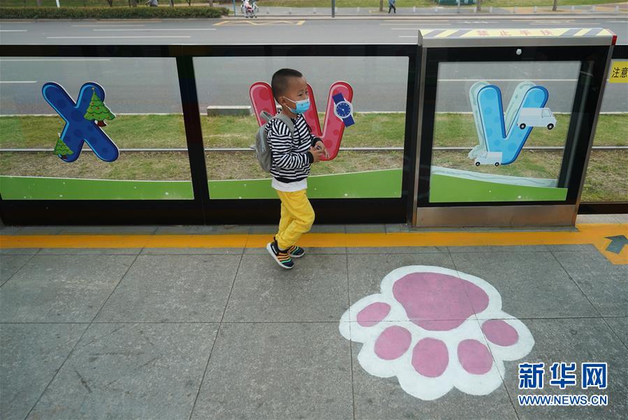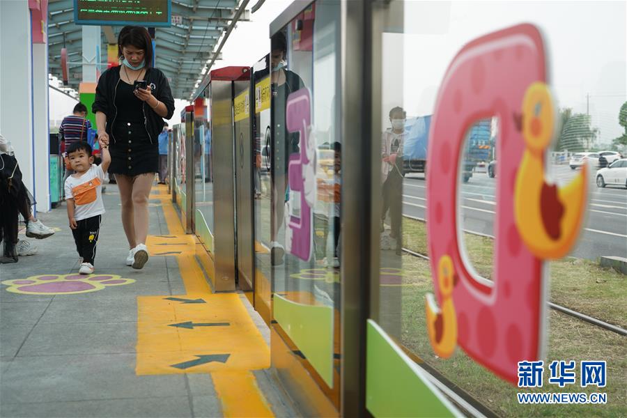 5月31日,一名小乘客在南京市建鄴區(qū)河西新城有軌電車友誼街站候車。新華社記者季春鵬攝