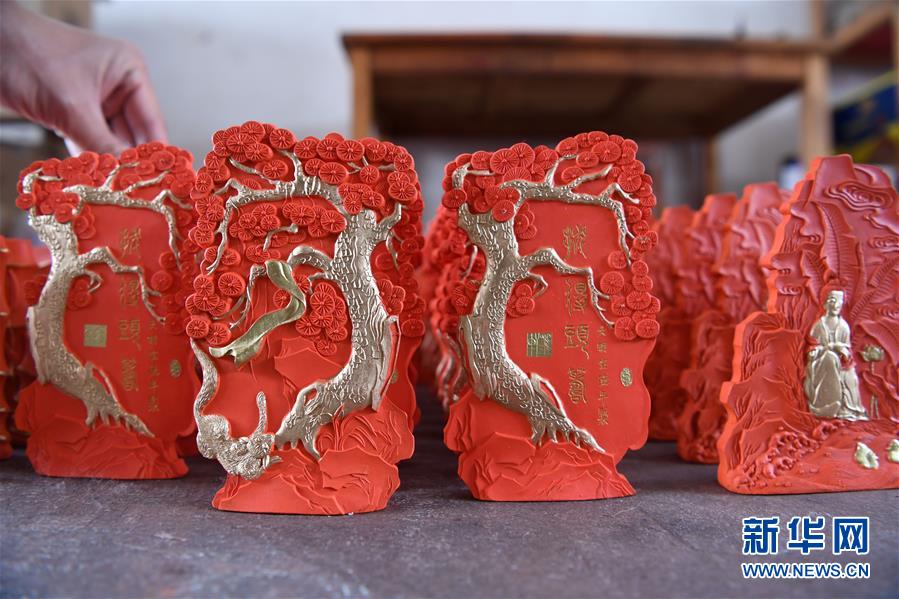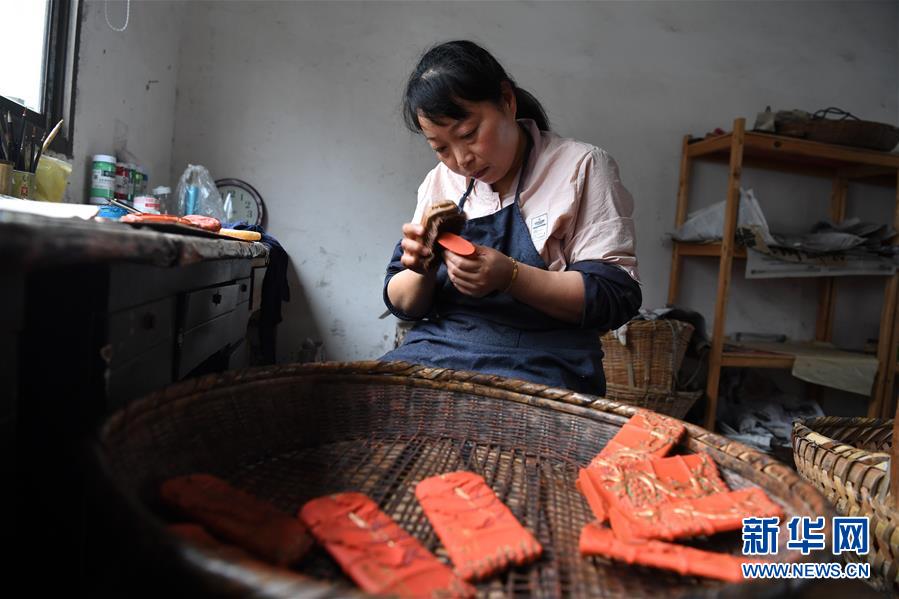 5月20日,安徽歙縣“項(xiàng)氏徽墨”的工人為晾干的墨進(jìn)行描金。新華社記者劉軍喜攝。