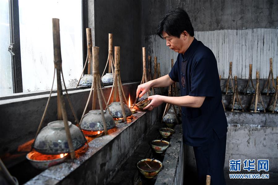 5月21日,安徽省非物質(zhì)文化遺產(chǎn)徽墨代表性傳承人項(xiàng)德勝在進(jìn)行古法煉煙。傳統(tǒng)徽墨制作工藝中,第一道工序就是煉煙。這一過程收集來(lái)的油煙是徽墨制作中最為重要的原材料。新華社記者張端攝。
