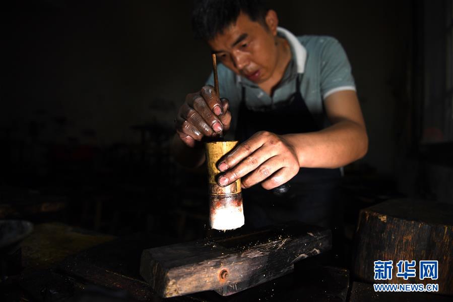 5月21日,安徽歙縣“項(xiàng)氏徽墨”的工人在捶打墨胚。新華社記者張端攝。