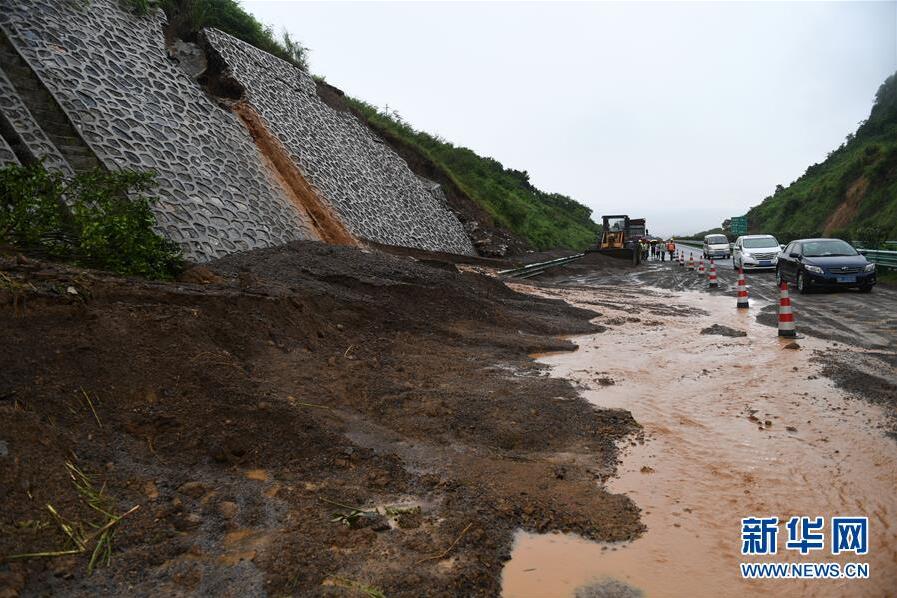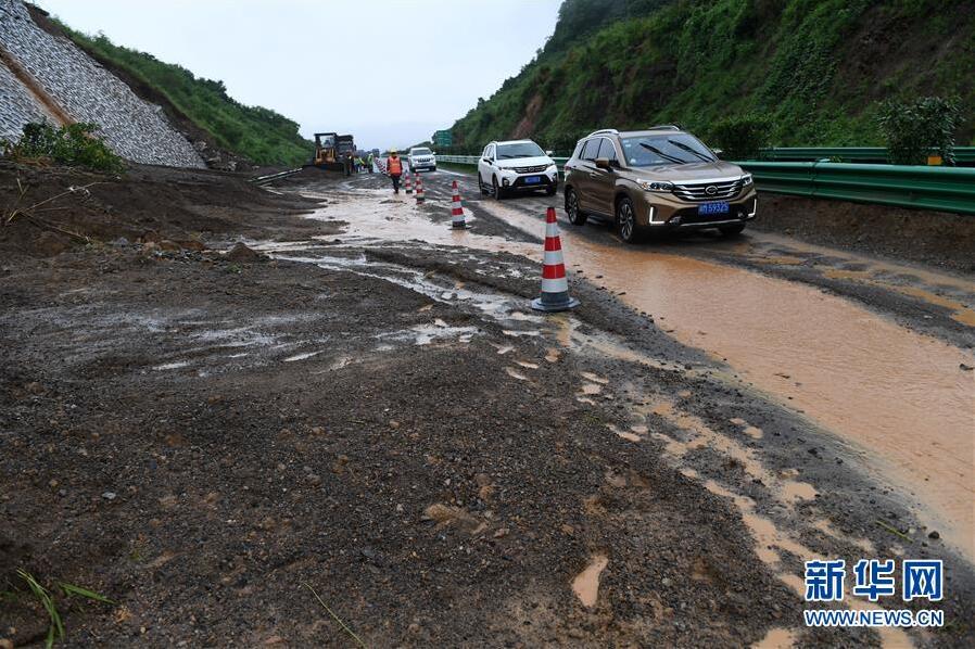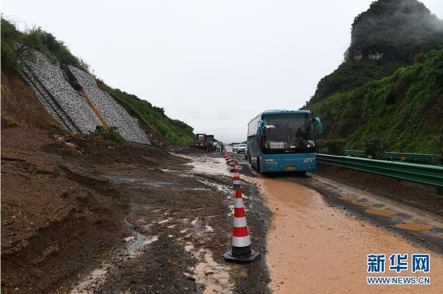 6月7日,在廣西鹿寨至陽朔的高速公路上,車輛從一處發(fā)生滑坡的路段經(jīng)過。新華社記者陸波岸攝