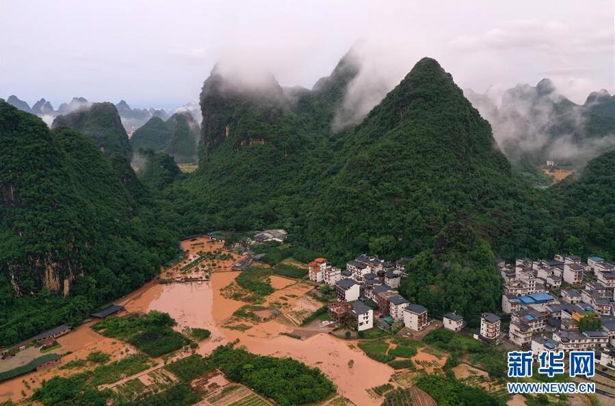 這是廣西陽朔縣部分出現(xiàn)嚴(yán)重積水的村莊(6月7日攝,無人機照片)。