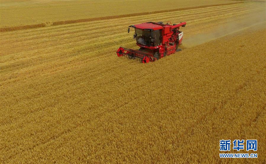 6月8日,聯(lián)合收割機(jī)在河北省南和縣閆里鄉(xiāng)閆里村麥田進(jìn)行夏收作業(yè)(無人機(jī)照片)。“三夏”期間,河北省預(yù)計(jì)組織和調(diào)度小麥聯(lián)合收割機(jī)、拖拉機(jī)、夏玉米播種機(jī)等200萬臺(tái)農(nóng)業(yè)機(jī)械投入作業(yè)。新華社記者朱旭東攝
