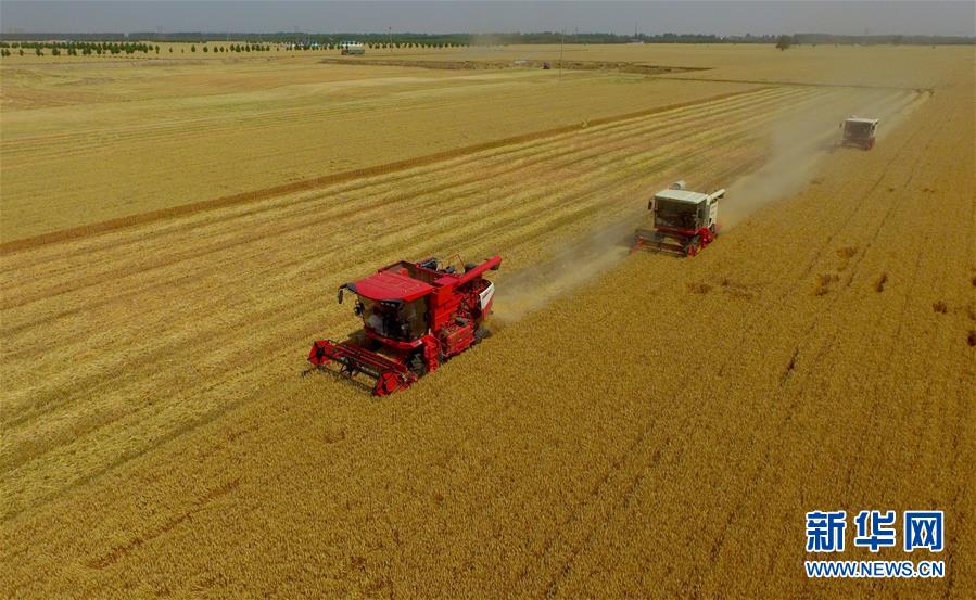 6月8日,聯(lián)合收割機(jī)在河北省南和縣閆里鄉(xiāng)閆里村麥田進(jìn)行夏收作業(yè)(無人機(jī)照片)?!叭摹逼陂g,河北省預(yù)計(jì)組織和調(diào)度小麥聯(lián)合收割機(jī)、拖拉機(jī)、夏玉米播種機(jī)等200萬臺(tái)農(nóng)業(yè)機(jī)械投入作業(yè)。新華社記者朱旭東攝