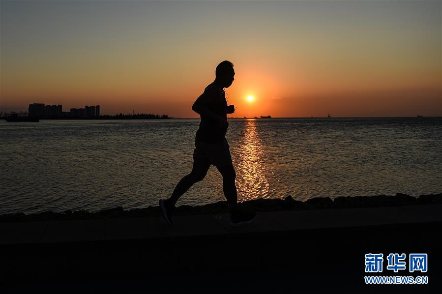 夜幕將至,一位市民在??谑兰o公園濱海步道跑步(5月15日拍攝)。近年來,夜跑成為越來越多都市人熱衷的健身方式之一。在海南???,每當夜幕降臨,“夜跑族”來到??谌f綠園、世紀公園等夜跑場所跑步,用一身酣暢淋漓的汗水擺脫白天工作中的壓力,享受跑步帶來的歡愉。新華社記者 蒲曉旭 攝