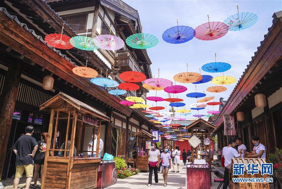 6月13日,市民在長春市世茂蓮花山小鎮(zhèn)寬厚里商街參觀游覽。當日是“文化和自然遺產(chǎn)日”。吉林長春首屆蓮花山消夏生活節(jié)在世茂蓮花山小鎮(zhèn)舉行?;顒訉⒎沁z展示與假日消暑休閑相結(jié)合,讓游人在“古色古香”的油紙傘巷中品傳統(tǒng)文化魅力,享夏日休閑愜意。新華社記者許暢攝。