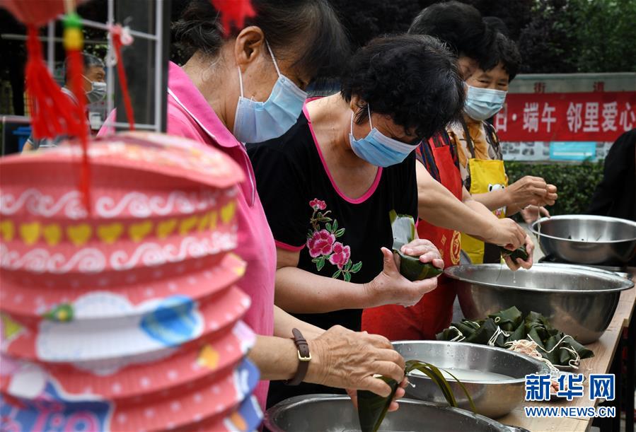 6月17日,水清溝街道居民在社區(qū)廣場上包粽子。當(dāng)日,青島市北區(qū)水清溝街道開展迎端午鄰里愛心傳遞進(jìn)網(wǎng)格活動,居民通過包粽子、吃粽子、網(wǎng)上端午傳統(tǒng)文化課等形式傳遞鄰里愛心,傳承民俗文化。新華社記者 李紫恒 攝