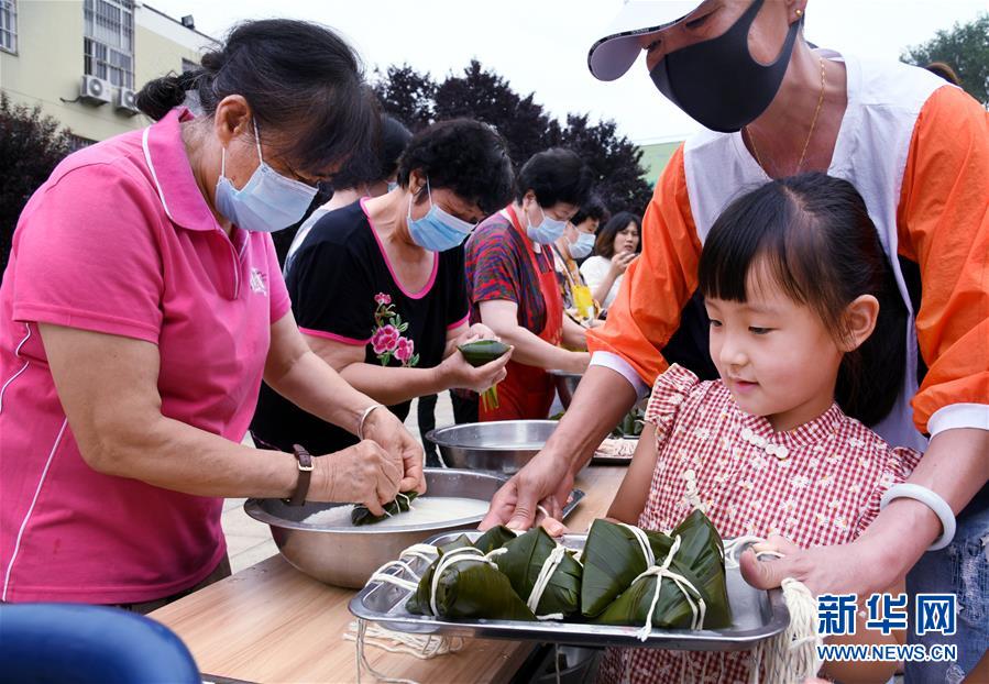 6月17日,水清溝街道居民在社區(qū)廣場(chǎng)上包粽子。新華社記者 李紫恒 攝