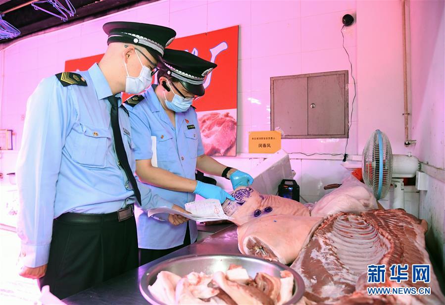6月17日,在位于北京市海淀區(qū)的增光鴻運(yùn)市場(chǎng),執(zhí)法人員對(duì)商戶出售的鮮肉進(jìn)行檢查。新華社記者 任超 攝