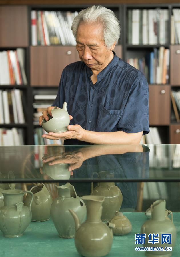 6月17日,在位于浙江慈溪的工作室,聞長(zhǎng)慶查看自己收藏的古越窯標(biāo)本。新華社記者 翁忻旸 攝