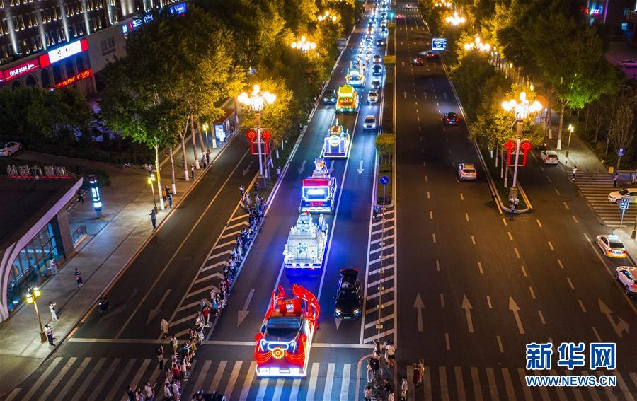 6月19日,花車在長春市人民大街上巡游(無人機照片)。