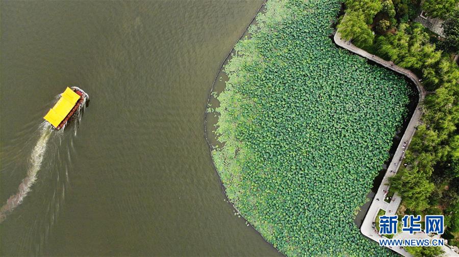 6月19日拍攝的大明湖畔的荷花池(無人機(jī)照片)。近日,山東濟(jì)南大明湖的荷花陸續(xù)綻放,吸引游客前來觀賞。新華社記者 王凱 攝
