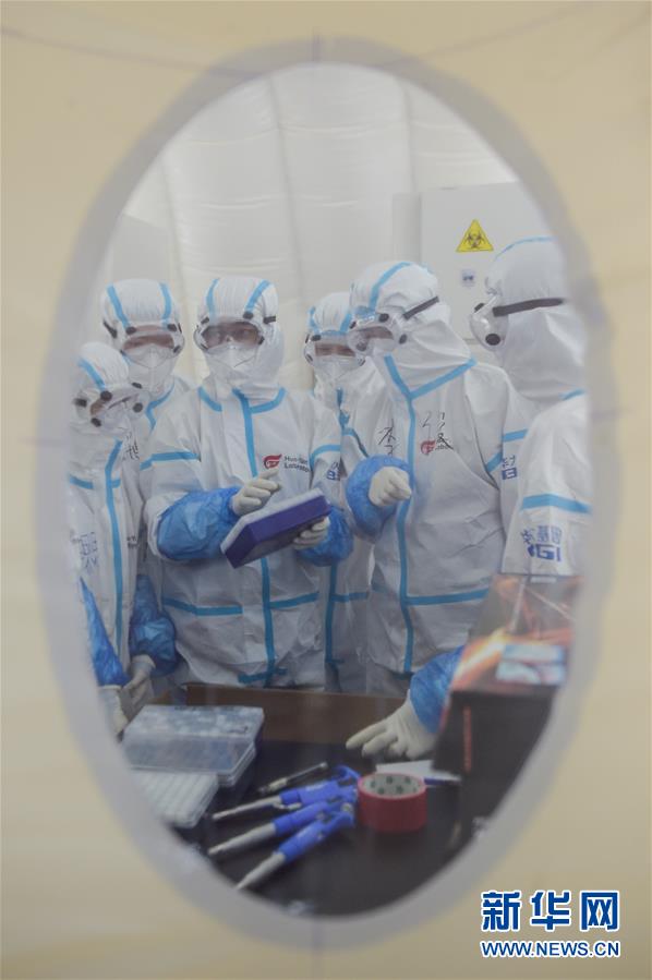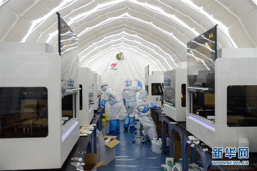出于北京市疫情防控工作的需要,北京大興區(qū)體育中心綜合館內(nèi)正在搭建一個(gè)可移動(dòng)、自動(dòng)化、大通量的核酸檢測(cè)實(shí)驗(yàn)室。目前,工人們正在緊張地進(jìn)行設(shè)備安裝和調(diào)試。據(jù)介紹,氣膜版“火眼”核酸檢測(cè)實(shí)驗(yàn)室6月19日下午開(kāi)始搭建。兩天多時(shí)間基本上完成了設(shè)備安裝和調(diào)試。9個(gè)高3.5米、占地70多平方米的拱形白色氣膜艙已搭建完畢,14臺(tái)自動(dòng)化核酸提取設(shè)備準(zhǔn)備就緒。這個(gè)北京首座氣膜版“火眼”核酸檢測(cè)實(shí)驗(yàn)室正式運(yùn)轉(zhuǎn)后,實(shí)驗(yàn)室核酸檢測(cè)能力可達(dá)到每天上萬(wàn)人份,緩解當(dāng)前核酸檢測(cè)壓力。新華社記者彭子洋攝
