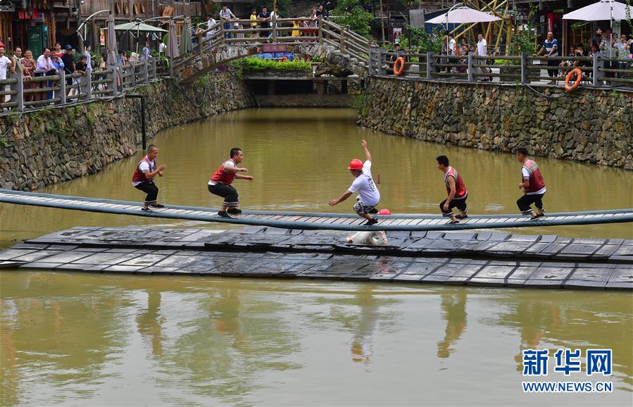 在廣西融水雙龍溝森林旅游度假區(qū)夢嗚苗寨,幾位搬遷戶協(xié)助游客挑戰(zhàn)“搖擺橋”(6月21日攝)。近年來,融水打造原生態(tài)苗族文化體驗園——夢嗚苗寨,讓搬遷進城的貧困戶住進復(fù)原建設(shè)的老房子。景區(qū)提供綠化保潔、游樂設(shè)施管理、民族歌舞表演等工作崗位,多渠道增加貧困戶收入。新華社記者黃孝邦攝