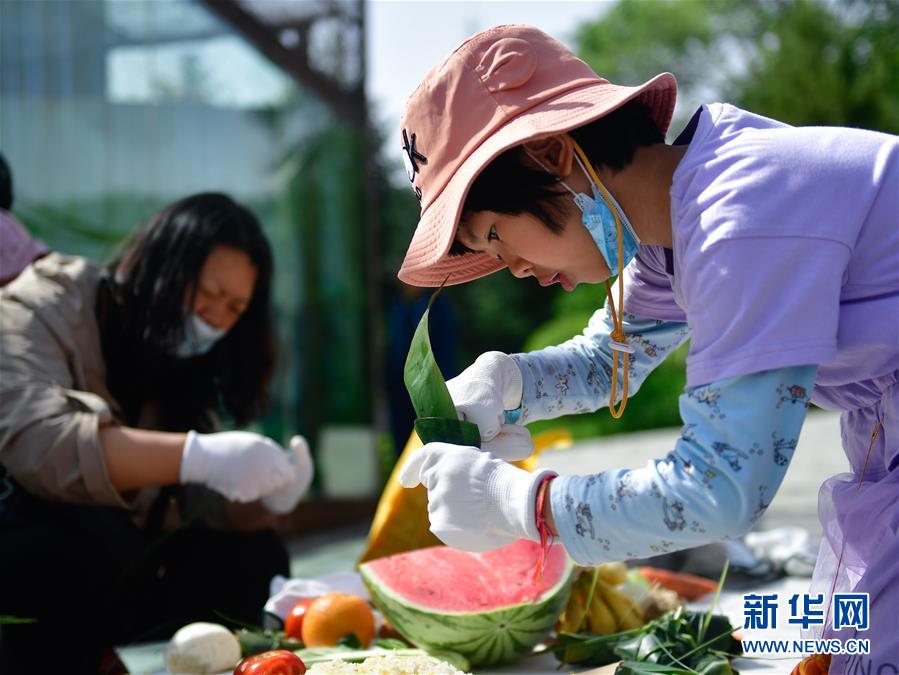 6月25日,在青海省西寧野生動(dòng)物園,一位小朋友在母親幫助下包粽子。新華社記者 張龍 攝