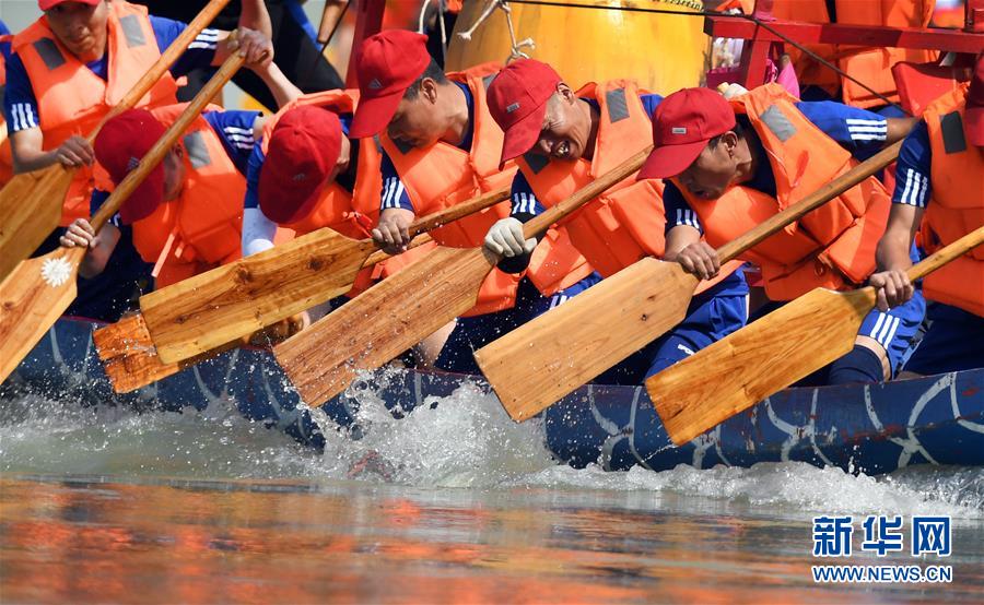 6月25日,參賽龍舟隊(duì)在比賽中。當(dāng)日是農(nóng)歷五月初五,是中國民間的傳統(tǒng)節(jié)日端午節(jié)。陜西省安康市第20屆龍舟節(jié)在漢江上舉行。每年端陽節(jié)前后,安康沿江一帶的縣區(qū)都舉行龍舟賽,賽龍舟成為民間自發(fā)的盛大活動(dòng)。新華社記者 陶明 攝