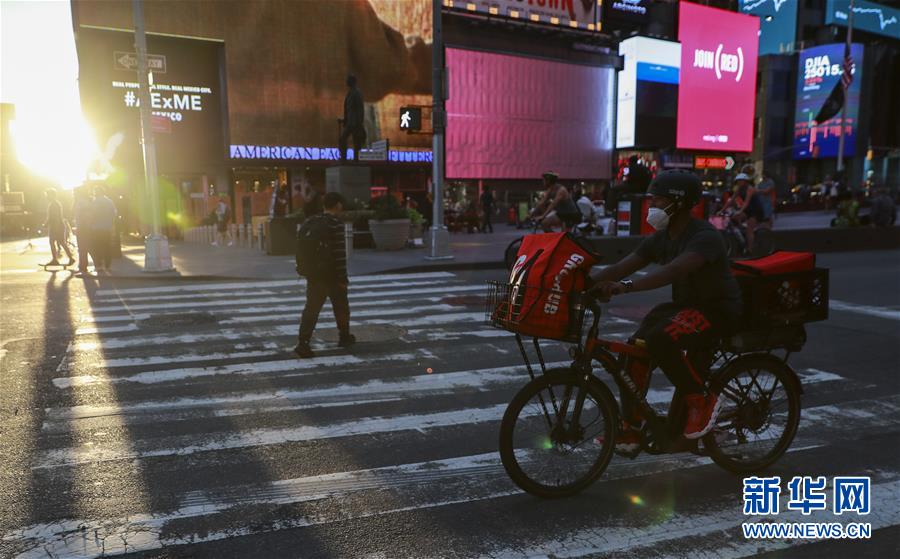 6月27日,一名送貨員騎車經(jīng)過美國紐約時報廣場。美國約翰斯·霍普金斯大學(xué)27日發(fā)布的新冠疫情最新統(tǒng)計數(shù)據(jù)顯示,截至美國東部時間27日16時35分(北京時間28日4時35分),美國累計新冠確診病例2500419例,累計死亡病例125434例。新華社記者王迎攝