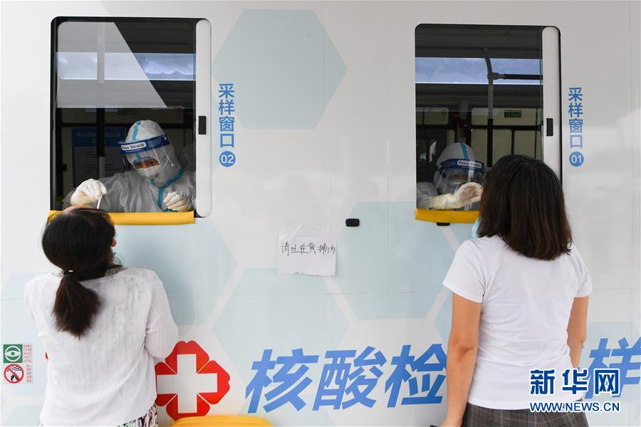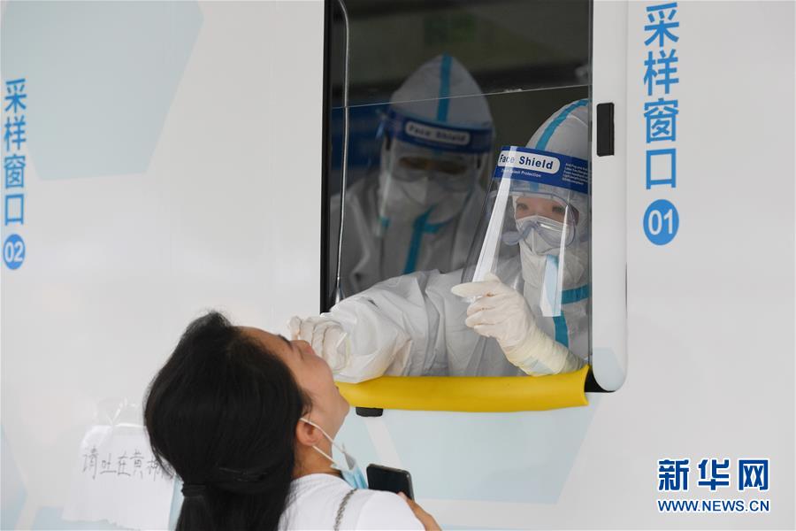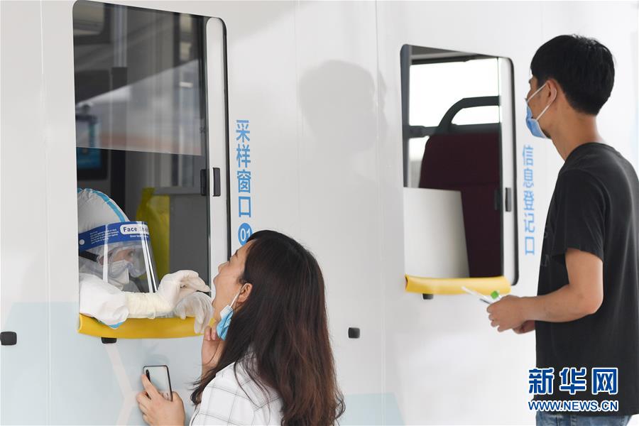 6月28日,在北京市西城區(qū)北京展覽館南側的露天廣場核酸檢測采樣點,核酸檢測采樣車內(nèi)的醫(yī)護人員為前來做檢測的人員進行采樣。新華社記者鞠煥宗攝