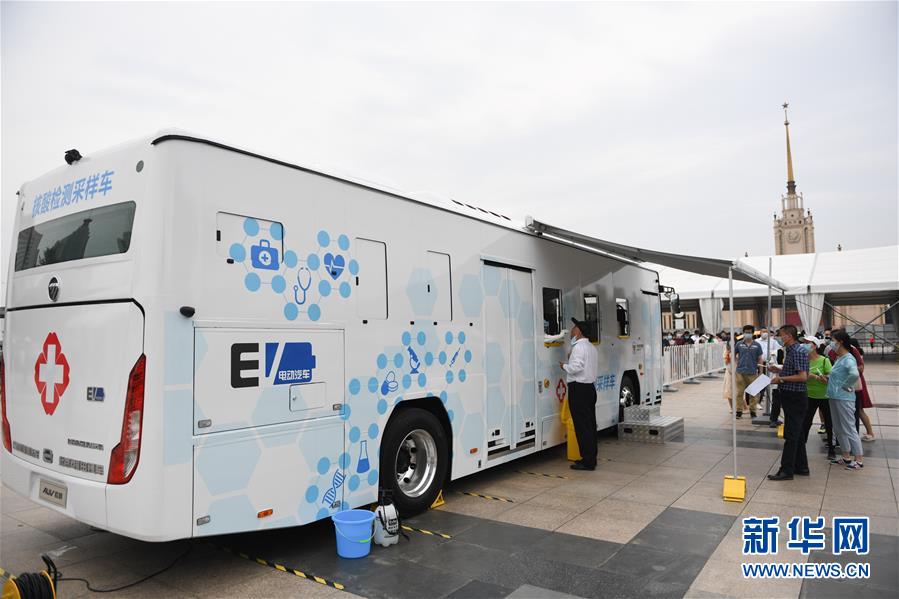 6月28日,在北京市西城區(qū)北京展覽館南側的露天廣場核酸檢測采樣點,前來做檢測的人員在核酸檢測采樣車旁排隊。新華社記者鞠煥宗攝