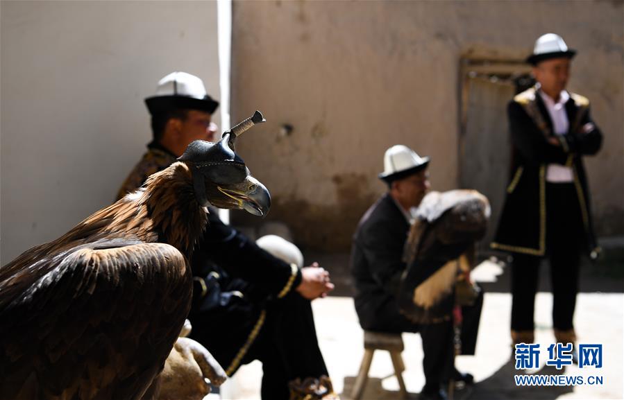 6月29日,庫爾馬西·胡特曼(右)和他的徒弟們展示獵鷹。新華社記者宋彥樺攝