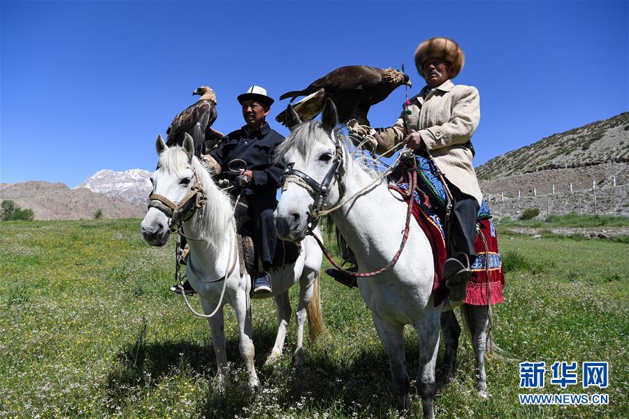 6月29日,庫爾馬西·胡特曼(右)和他的徒弟帶著獵鷹出游。新華社記者宋彥樺攝