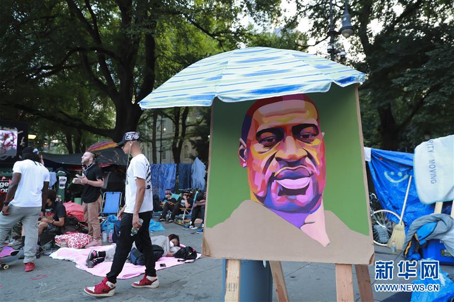 這是6月30日在美國紐約市政廳外“占領(lǐng)市政廳”抗議活動(dòng)現(xiàn)場(chǎng)拍攝的弗洛伊德畫像。由美國明尼蘇達(dá)州明尼阿波利斯市非裔男子弗洛伊德遭白人警察暴力執(zhí)法而死一事引發(fā)的各種抗議活動(dòng)仍在紐約持續(xù)進(jìn)行。新華社記者王迎攝