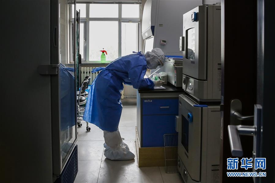 7月3日,中日友好醫(yī)院檢驗(yàn)科新冠核酸檢測(cè)實(shí)驗(yàn)室的檢驗(yàn)人員張?chǎng)稳〕鼋?jīng)過(guò)滅活的樣本。新華社記者張玉薇攝
