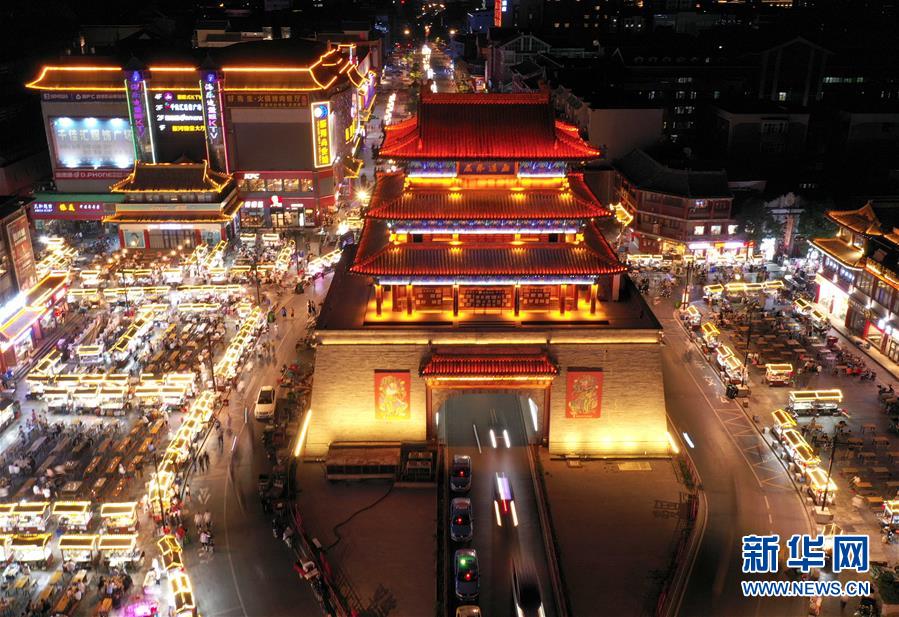 這是6月1日拍攝的河南開封鼓樓夜市(無人機照片)。新華社記者 李安 攝