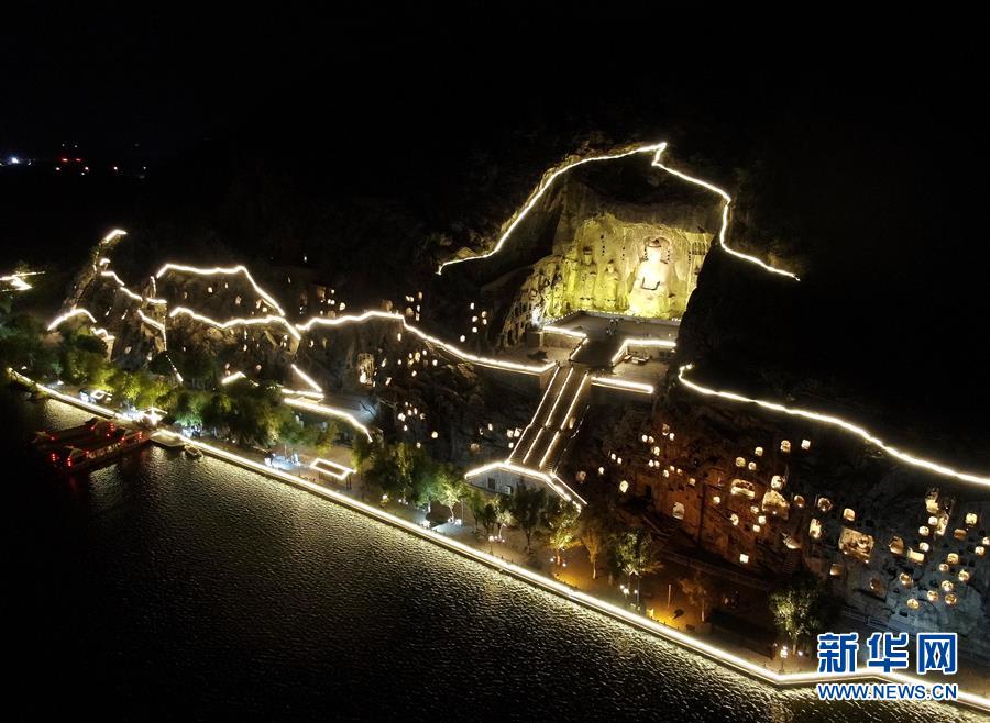 這是6月8日拍攝的洛陽龍門石窟景區(qū)夜景(無人機照片)。新華社記者 李安 攝