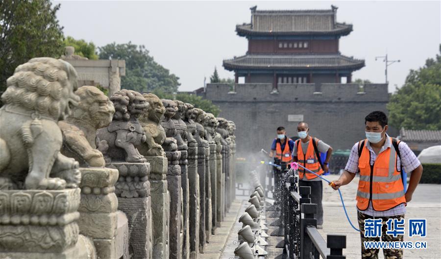 7月4日,防疫人員在盧溝橋景區(qū)進(jìn)行環(huán)境消毒。當(dāng)日,北京市豐臺(tái)區(qū)組織防疫人員、安全監(jiān)察部門人員對(duì)社區(qū)、超市、公共場(chǎng)所進(jìn)行大規(guī)模環(huán)境消毒及疫情隱患排查,全力保障市民生活和工作環(huán)境安全。新華社記者 李欣 攝