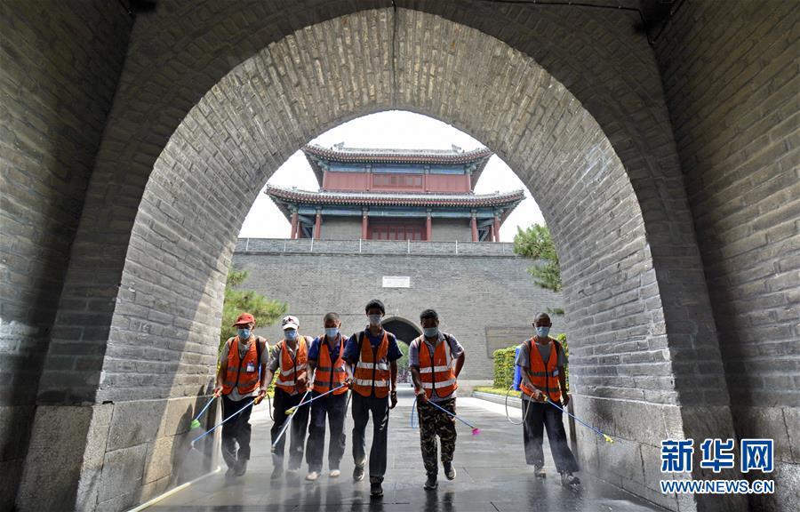 7月4日,防疫人員在宛平古城進(jìn)行環(huán)境消毒。當(dāng)日,北京市豐臺(tái)區(qū)組織防疫人員、安全監(jiān)察部門人員對(duì)社區(qū)、超市、公共場(chǎng)所進(jìn)行大規(guī)模環(huán)境消毒及疫情隱患排查,全力保障市民生活和工作環(huán)境安全。新華社記者 李欣 攝