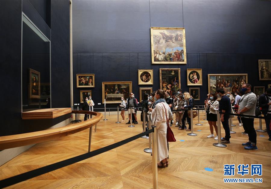 7月6日,參觀者在法國(guó)巴黎盧浮宮博物館欣賞萊昂納多·達(dá)·芬奇的名作《蒙娜麗莎》。因新冠病毒疫情關(guān)閉3個(gè)多月后,法國(guó)盧浮宮博物館于6日重新開(kāi)放。新華社記者高靜攝