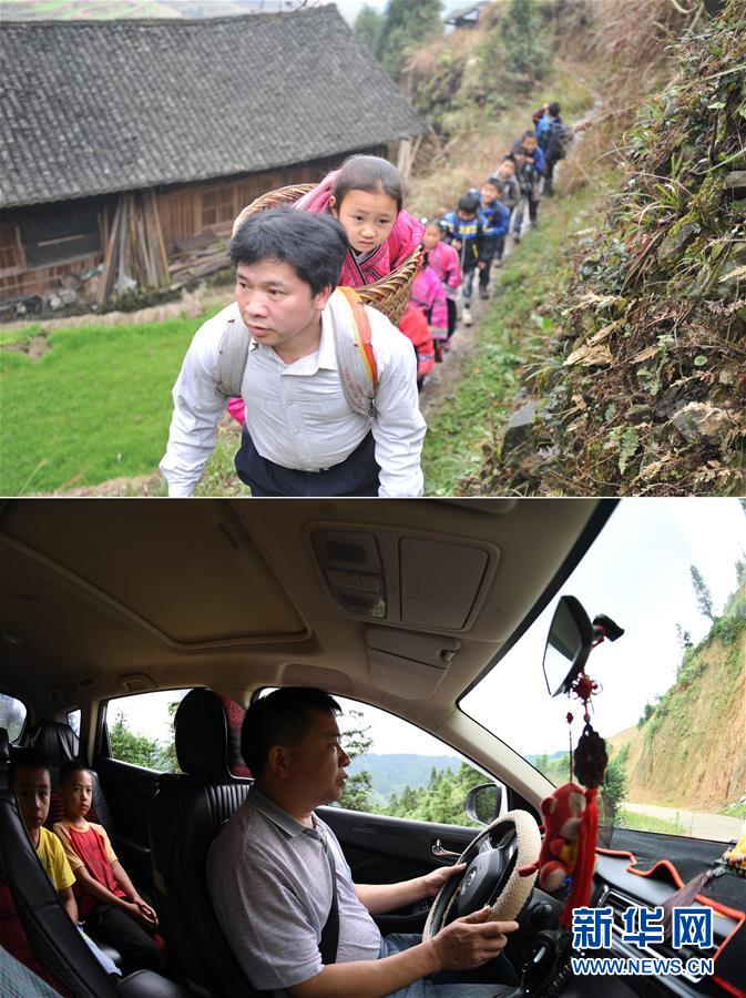 這是一張拼版照片,上圖:在廣西龍勝龍脊鎮(zhèn)江柳村,余啟貴老師在放學(xué)路上將一個(gè)走不動(dòng)了的孩子背在背簍里,領(lǐng)著其他孩子一起回家(2013年2月26日攝);下圖:在廣西龍勝龍脊鎮(zhèn)江柳村,余啟貴老師開著自己的汽車帶著學(xué)生去學(xué)校(7月7日攝)。新華社記者陸波岸攝