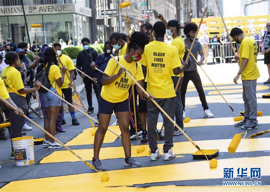 7月9日,在美國(guó)紐約第五大道特朗普大廈前,人們涂寫“黑人的命也是命”標(biāo)語(yǔ)。當(dāng)天,數(shù)十人在紐約第五大道特朗普大廈前的路面上涂寫“黑人的命也是命”標(biāo)語(yǔ)。紐約市計(jì)劃在多處地點(diǎn)涂寫“黑人的命也是命”標(biāo)語(yǔ)。新華社記者王迎攝