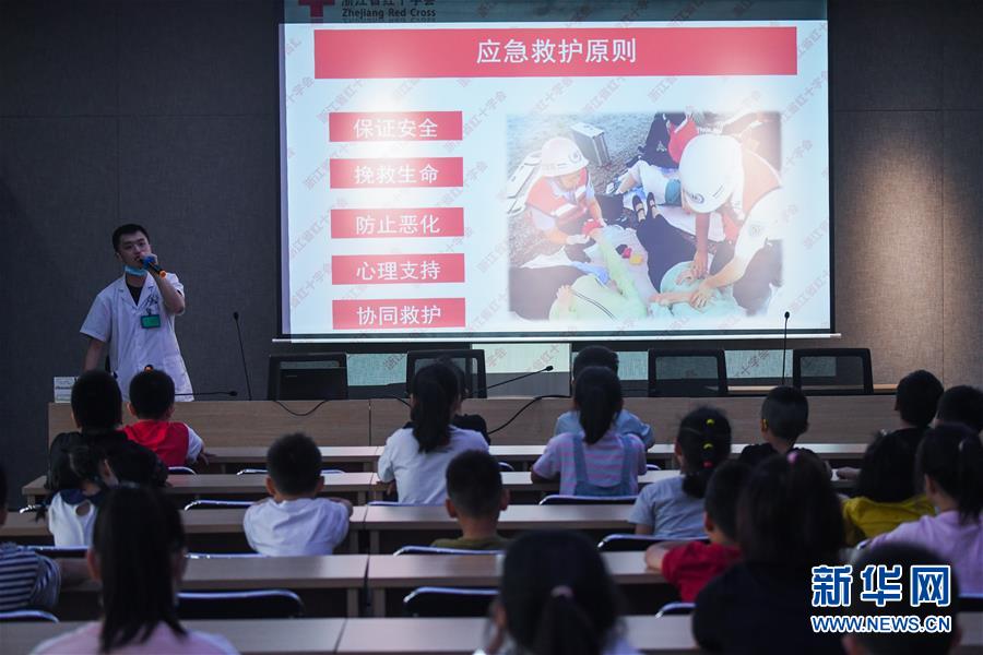 7月16日,東林鎮(zhèn)衛(wèi)生院的醫(yī)護(hù)人員(左一)在給學(xué)生們上應(yīng)急救護(hù)課。當(dāng)日,浙江省湖州市吳興區(qū)東林鎮(zhèn)舉辦暑期“安全防護(hù)小超人”主題活動?;顒佑舍t(yī)護(hù)人員、消防隊員等為學(xué)生及家長講授日常安全避險及溺水急救知識,中小學(xué)們還在現(xiàn)場學(xué)習(xí)了簡易包扎、心肺復(fù)蘇的正確方式,并了解滅火器、滅火毯等消防器材的使用,為學(xué)生平安過暑期打好安全防護(hù)“預(yù)防針”。新華社記者 徐昱 攝