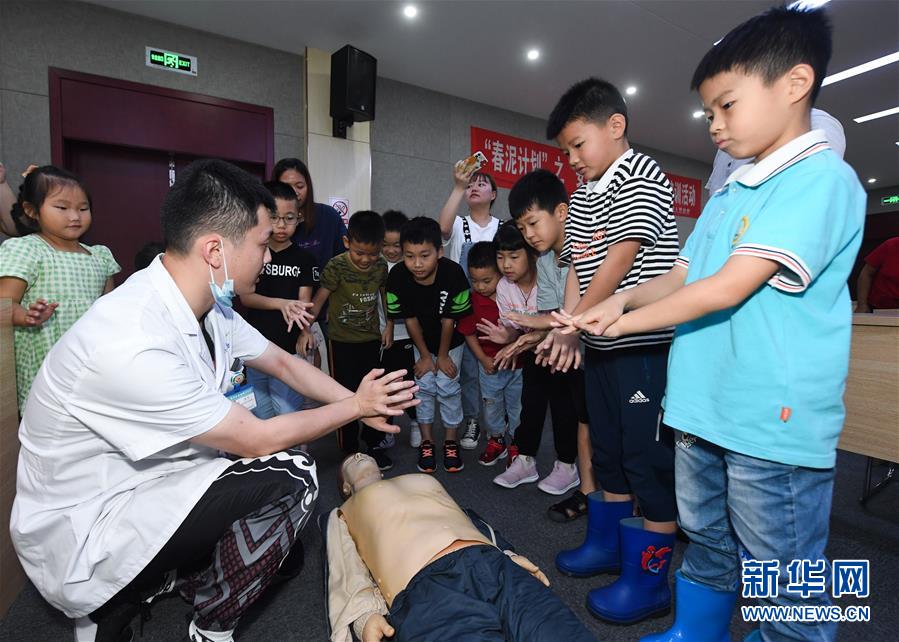 7月16日,東林鎮(zhèn)衛(wèi)生院的醫(yī)護(hù)人員(左一)在給學(xué)生們示范和講解心肺復(fù)蘇的操作知識。當(dāng)日,浙江省湖州市吳興區(qū)東林鎮(zhèn)舉辦暑期“安全防護(hù)小超人”主題活動?;顒佑舍t(yī)護(hù)人員、消防隊員等為學(xué)生及家長講授日常安全避險及溺水急救知識,中小學(xué)們還在現(xiàn)場學(xué)習(xí)了簡易包扎、心肺復(fù)蘇的正確方式,并了解滅火器、滅火毯等消防器材的使用,為學(xué)生平安過暑期打好安全防護(hù)“預(yù)防針”。新華社記者 徐昱 攝