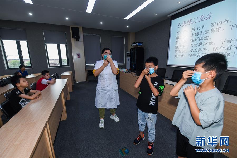 7月16日,小學(xué)生在東林鎮(zhèn)衛(wèi)生院醫(yī)護人員的示范和講解下學(xué)習(xí)正確佩戴口罩。當(dāng)日,浙江省湖州市吳興區(qū)東林鎮(zhèn)舉辦暑期“安全防護小超人”主題活動。活動由醫(yī)護人員、消防隊員等為學(xué)生及家長講授日常安全避險及溺水急救知識,中小學(xué)們還在現(xiàn)場學(xué)習(xí)了簡易包扎、心肺復(fù)蘇的正確方式,并了解滅火器、滅火毯等消防器材的使用,為學(xué)生平安過暑期打好安全防護“預(yù)防針”。新華社記者 徐昱 攝