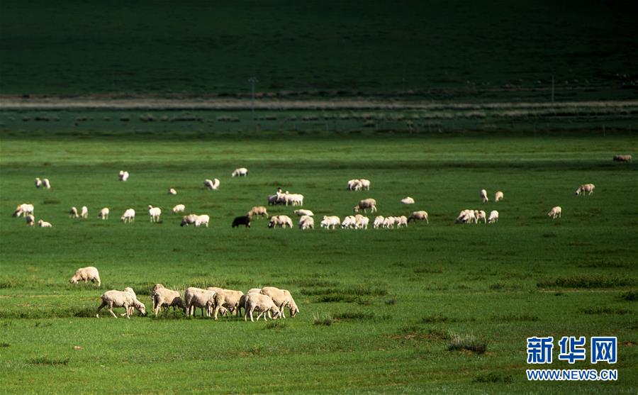 7月18日,羊群在內蒙古錫林郭勒盟正鑲白旗境內的草原上覓食。連日來,內蒙古錫林郭勒盟迎來多次降雨,境內廣袤的草原經(jīng)過雨水的滋潤,煥發(fā)出勃勃生機。新華社記者連振攝