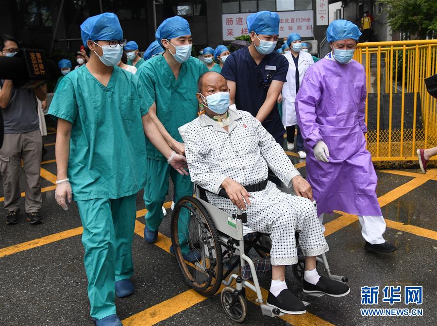 7月21日,武漢大學人民醫(yī)院醫(yī)護人員護送崔先生出院。新華社記者程敏攝