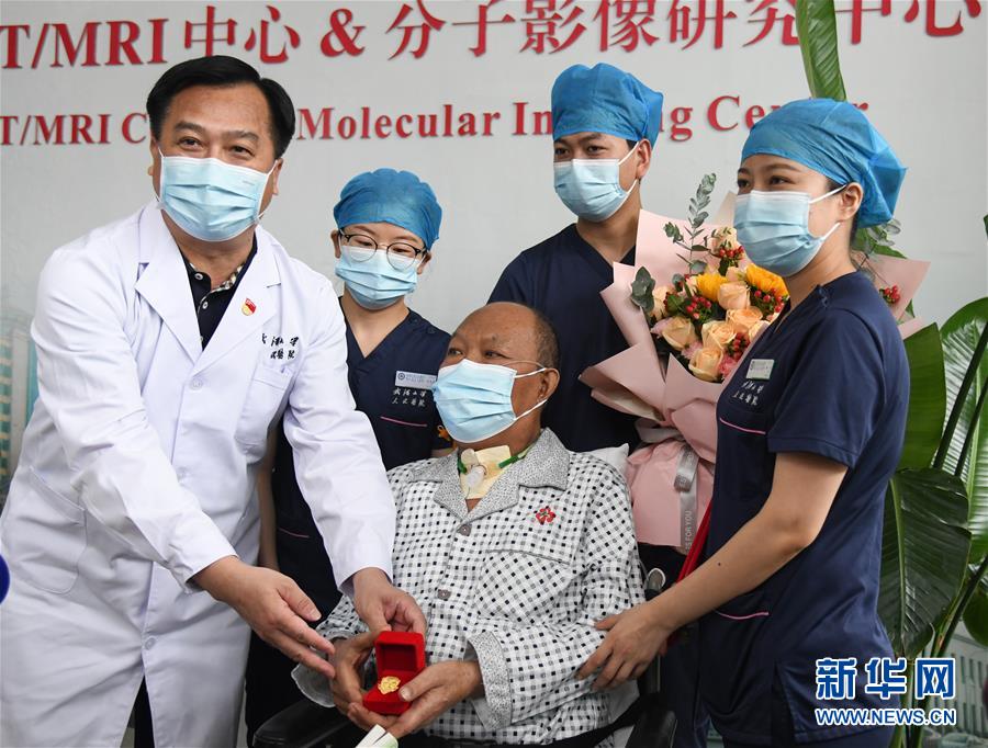 7月21日,武漢大學(xué)人民醫(yī)院黨委書記萬紅慧(左一)為崔先生贈(zèng)送徽章。新華社記者程敏攝
