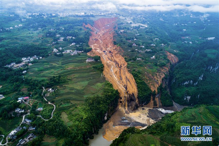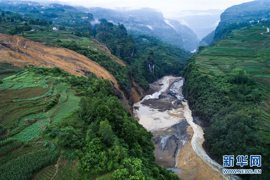 7月22日拍攝的因恩施州屯堡鄉(xiāng)馬者村山體滑坡形成的堰塞湖(無人機(jī)照片)。