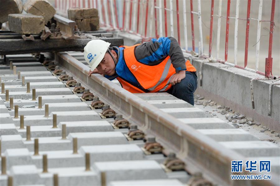 中鐵一局的施工人員在格庫鐵路新疆段查看軌排鋪設(shè)情況(7月19日攝)。新華社記者 丁磊 攝