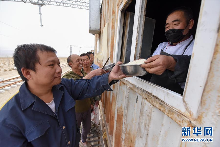 在索爾庫里宿營地,中鐵一局的施工人員排隊(duì)打飯(7月19日攝)。新華社記者 丁磊 攝
