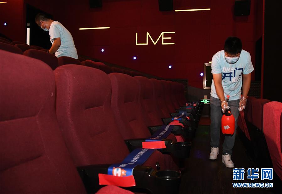 7月24日,在UME影城北京華星店1號影廳,工作人員進行消殺清潔工作。當(dāng)日,在做好新冠肺炎疫情防控的前提下,北京市部分電影院有序恢復(fù)開放。新華社記者 任超 攝