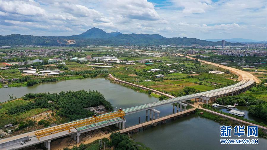 潮汕環(huán)線高速公路北溪河橋正在架梁(無人機(jī)照片,7月31日攝)。新華社記者劉大偉攝