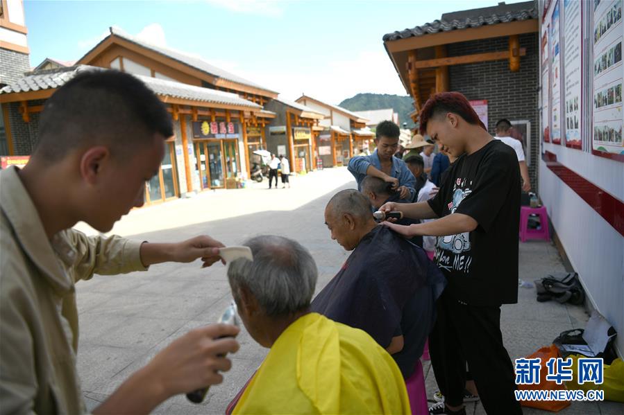 志愿者在柏楊林易地扶貧搬遷安置點(diǎn)為老人免費(fèi)理發(fā)(8月3日攝)。貴州省畢節(jié)市七星關(guān)區(qū)柏楊林易地扶貧搬遷安置點(diǎn)是畢節(jié)市最大的易地扶貧搬遷安置點(diǎn),總面積約1.1平方公里,從2017年開(kāi)始至今,共有34個(gè)鄉(xiāng)鎮(zhèn)6372戶29001人安置到位。如今,安置點(diǎn)內(nèi)教育、醫(yī)療、就業(yè)扶貧車間、長(zhǎng)幼日間托養(yǎng)照料中心等設(shè)施齊全,搬遷群眾在這里過(guò)上了安居樂(lè)業(yè)的幸福生活。新華社記者金良快攝